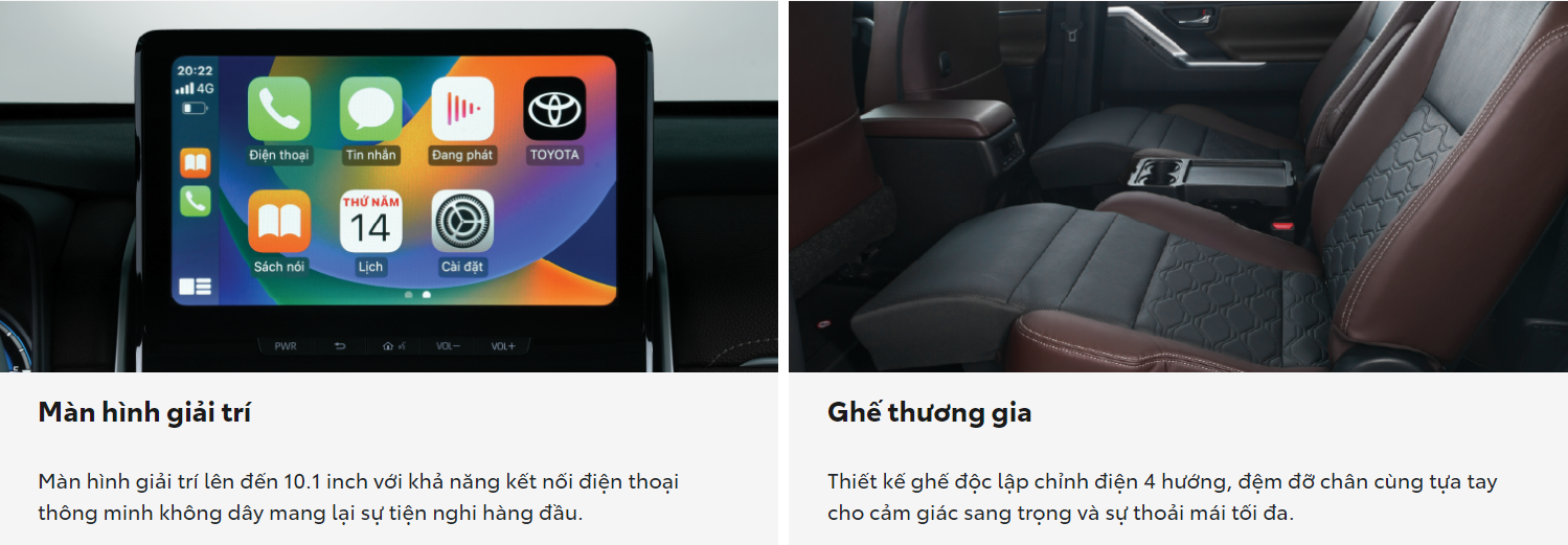 Lưu ý: Công ty Ô tô Toyota Việt Nam được quyền thay đổi bất kỳ đặc tính nào mà không báo trước. Một số đặc tính kỹ thuật có thể khác so với thực tế.