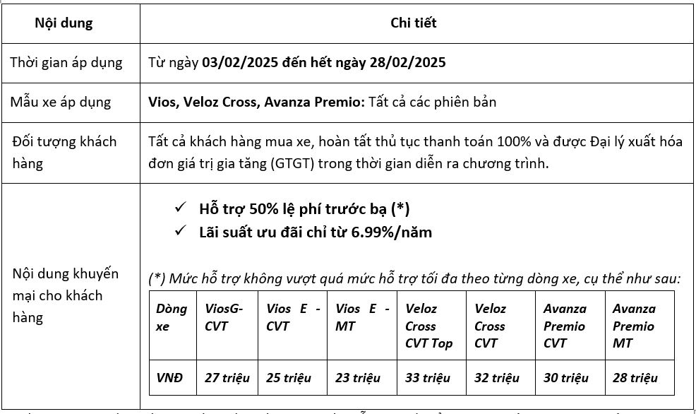 TOYOTA VIỆT NAM TRIỂN KHAI CHƯƠNG TRÌNH KHUYẾN MẠI “KHAI XUÂN – MỞ LỘC VÀNG” CHO MẪU XE VIOS, VELOZ CROSS, AVANZA PREMIO TRONG THÁNG 2/2025